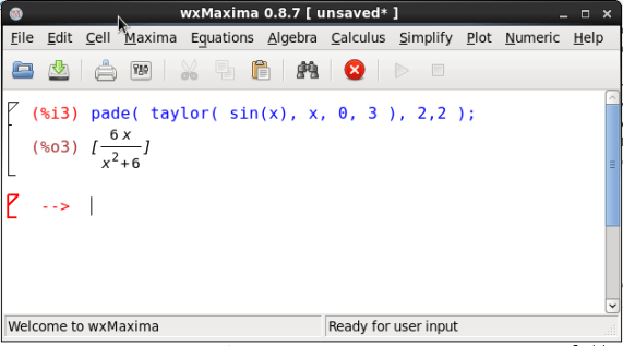 The function taylor() generate a taylor series. In the example above, we are generating a taylor series for sin(x) with the variable x centred at 0 and we need 3 terms of the taylor series. This taylor series is an input for the Pade approximation. This function requires a taylor series. Here the arguments 2,2 are the degrees of numerator and denominator for rational approximating polynomials. You need to do a shift-enter to execute the command.