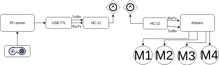 4 servos (PWM) and an hc12 (serial communication) are connected on an Arduino. This Arduino is powered by a battery. The Arduino reads incoming data from the hc12 module. The data is expected to be 4 numbers. It parsed in the Arduino and servos are driven accordingly. On a pc, another hc12 module is connected through USB-TTL device. We send data to it using cutecom on Ubuntu.