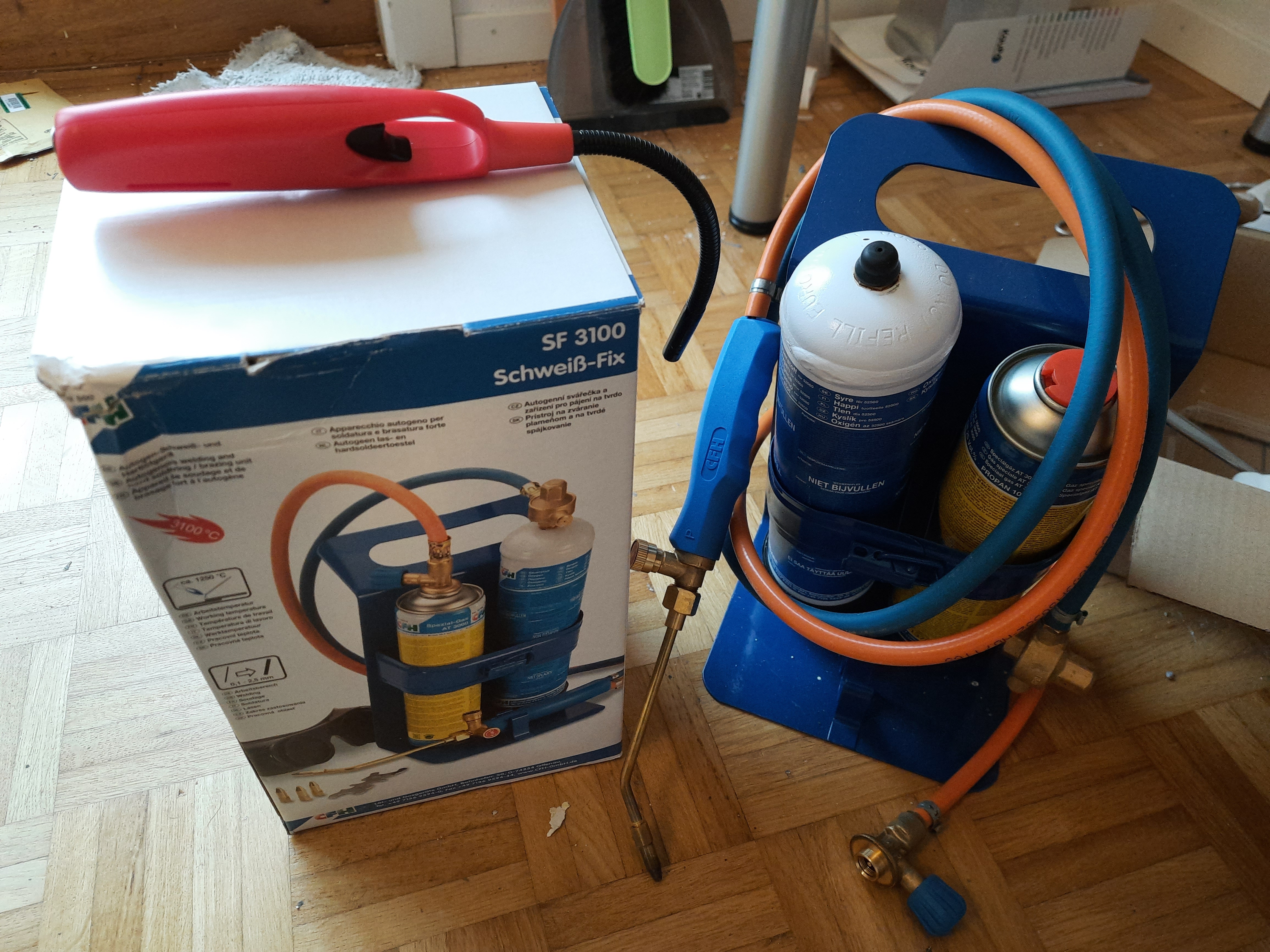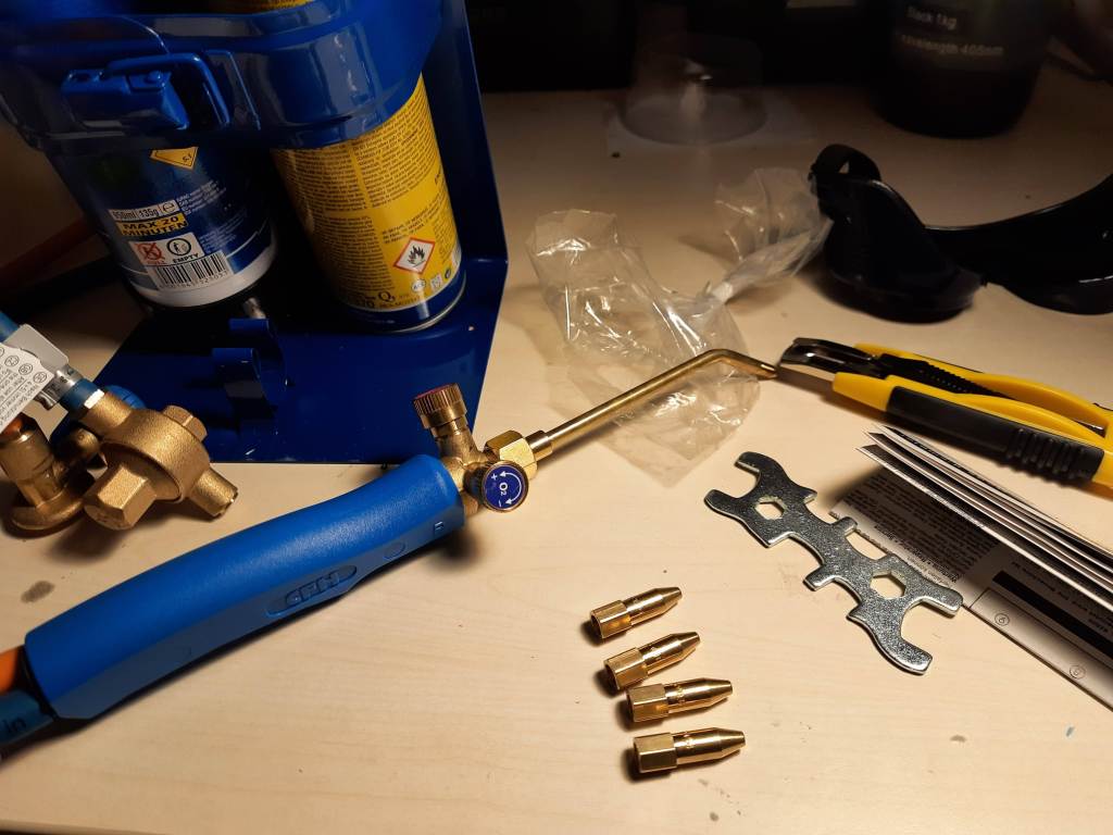 – Connect the oxygen tank. My torch has a left-handed threads for the oxygen tank.