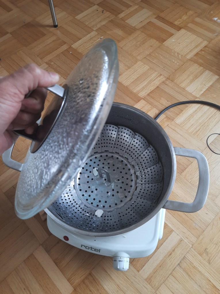 For steam de-waxing I used a hot plate, ikea steamer insert and a steam pot (covered). This actually works great. It usually can get rid of 95% (a guess-estimate) of the wax in an hour of steam de-waxing. The wax goes into the water in the pot, but does not smoke, which is great for a small home setup. If you try to put this directly in an oven, you get weird smell of wax burning, which is not very desirable. Be sure to put the flasks inverted on the steamer plate so that the wax flows out into the water underneath.
