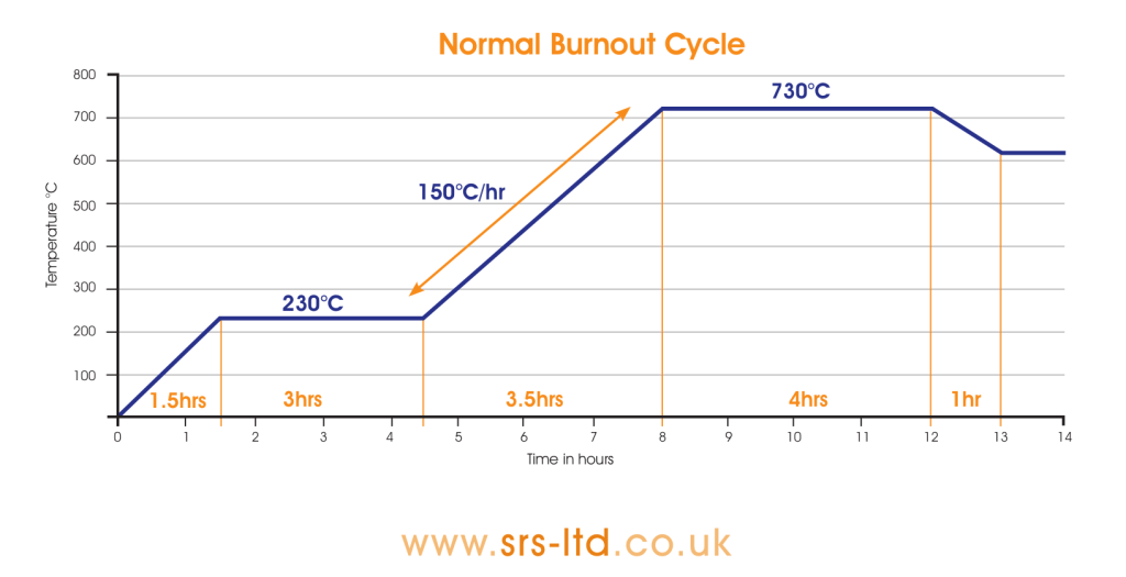 – Cooking oven burnout, raising the temperature from 110 deg C to 230 deg C in about 1.5 hrs. Followed by hold 230 for 2 hours and then 275 deg for 1.5 hrs.