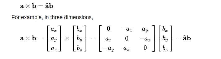Next we want to show that is a skew-symmetric matrix. We want to prove that because, in that case the eq(2) can be viewed as a cross product. Recall that for a matrix A to be skew-symmetric its transpose has to be the negative of it. For a skew-symmetric matrix A,